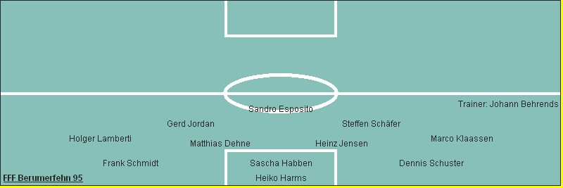 TuS Halbemond: Jann Lottmann, Benjamin Frerichs, Frank Rosenberg, Sascha Nannen, Michael Neuhaus, Ewald Bogena, Peter Nikolic, Mario Geiken, Jochen Feeken, Günther Delewski, Frank Bogena FFF Berumerfehn 95: Heiko Harms - Dennis Schuster, Sascha Habben, Frank Schmidt - Marco Klaassen, Heinz Jensen, Matthias Dehne, Holger Lamberti - Steffen Schäfer, Gerd Jordan - Sandro Esposito; Trainer: Johann Behrends Eingewechselt: Jochen Neiße, Sascha Betten Tore: 1:0 Frank Rosenberg (Nach Torwartfehler, 4.); 2:0 Sascha Nannen (Freistehend nach langem Ball in die Spitze, 9.); 3:0 Peter Nikolic (Abseitsverdächtig, 47.); 4:0 Michael Neuhaus (Aus kurzer Entfernung, 55.); 4:1 Sandro Esposito (Freistehend aus kurzer Distanz eingeschoben, 70. / Steffen Schäfer); 5:1 Frank Rosenberg (Freistehend nach langem Ball in die Spitze, 88.); 6:1 Benjamin Frerichs (Heber über den Torwart, 90.) Gelbe Karte: - / Matthias Dehne (2.) (27.), Dennis Schuster (2.) (34.), Frank Schmidt (3.) (60.) Gelb/Rote Karte: - / Frank Schmidt (75.) Rote Karte: Sascha Nannen (60., Nachschlagen gegen Frank Schmidt) / - Vergebener Elfmeter: - / Sascha Habben (Foulelfmeter, 83., vom TW gesehen links vorbei) Eine deftige Niederlage bezogen die Fehntjer-Fußball-Freunde mit dem 1-6 beim TuS Halbemond. Die ersten zehn Minuten verschliefen die Fehntjer völlig. Nach einem weiten Einwurf und einem groben Patzer von TW Heiko Harms war der Halbemonder Frank Rosenberg zur Stelle und staubte in der 4. Min. zur Führung ab. In der 9. Min. kam der Ball nach einem langen Pass von Frank Rosenberg zu Sascha Nannen, der zum 2-0 für den TuS verwandelte. FFF kam nach dem Doppelschlag besser ins Spiel, erarbeitete sich jetzt ein Übergewicht, konnte allerdings die sich bietenden Gelegenheiten nicht nutzen. Die einzige Ausbeute war ein Kopfball von Sandro Esposito an die Torlatte. Für die zweite Hälfte hatten sich die Gäste einiges vorgenommen, und mit Jochen Neiße und Sascha Betten wurden zwei offensive Spieler eingewechselt. Doch nach nicht einmal zwei Minuten wurde alles, was man sich vorgenommen hatte, über den Haufen geworfen. Einen Ballverlust von Heinz Jensen am gegnerischen Strafraum nutzten die Gastgeber zu einem Steilpass in die Spitze, wo es Frank Schmidt versäumte, seinen Gegenspieler abseits zu stellen, und Peter Nikolic erzielte das 3-0 für Halbemond. Ein weiterer Ballverlust von Heinz Jensen nach einem Einwurf für die FFF ermöglichte es den Halbemondern in der 55. Min., einen einfachen Diagonalpass, den Holger Lamberti nicht verhindern konnte, in den Strafraum zu spielen, und Michael Neuhaus erzielte freistehend das 4-0. Nachdem Sascha Nannen in der 60. Min. für sein rüdes Nachschlagen gegen Frank Schmidt die mehr als berechtigte rote Karte gesehen hatte, bäumten sich die Gäste aus Berumerfehn auf. Es folgte ein einziger Sturmlauf auf das von Jann Lottmann hervorragend gehütete Tor des TuS Halbemond. Sandro Esposito tauchte 3 x völlig freistehend vor Lottmann auf, konnte den Halbemonder Schlussmann aber nicht bezwingen. Holger Lamberti scheiterte mit einem als Flanke gedachten Schuss am Querbalken, und zu allem Überfluss vergab Sascha Habben in der 83. Min. einen Foulelfmeter. Vorher war Steffen Schäfer gefoult worden. Zwischenzeitlich hatte Frank Schmidt (FFF) in der 75. Min. die gelb-rote Karte erhalten. In den Schlussminuten nutzten dann die Halbemonder die sich bietenden Räume nach unnötigen Ballverlusten der Fehntjer zu zwei schnellen Kontern. Frank Rosenberg in der 88. Min. und Benjamin Frerichs in der 90. Min., der den Ball über TW Heiko Harms lupfte, sorgten für den verdienten, aber sicher viel zu hoch ausgefallenen Sieg der Halbemonder. |