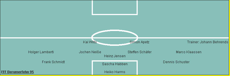 FFF Berumerfehn 95: Heiko Harms - Dennis Schuster, Sascha Habben, Frank Schmidt - Heinz Jensen - Marco Klaassen, Steffen Schäfer, Jochen Neiße, Holger Lamberti - Simon Apetz, Kai Wilts; Trainer: Johann Behrends Eingewechselt: Stefan Fischer, Gerd Jordan Tore: 0:1 Sascha Habben (Foulelfmeter, 65. / Kai Wilts); 0:2 Jochen Neiße (Kopfball nach Flanke von rechts, 69. / Steffen Schäfer) Gelbe Karte: - / Kai Wilts (7.) (59.), Frank Schmidt (6.) (86.), Steffen Schäfer (4.) (90+2.) Überraschend, doch völlig verdient gewannen die Fehntjer-Fußball-Freunde das Auswärtsspiel beim Tabellendritten RSV Visquard und bleiben damit in den bisherigen fünf Rückrundenspielen ungeschlagen. Schon die Anfangsphase zeigte, dass an diesem Tag bei den zuhause bisher ungeschlagenen Krummhörnern etwas zu holen war. Bereits in der 3. Min. vergab Heinz Jensen eine große Torgelegenheit für die Gäste aus Berumerfehn, als er nach einem Eckball von Steffen Schäfer das Tor nur knapp verfehlte. Auch in der Folgezeit blieben die Gäste tonangebend, erarbeiteten sich einige gute Chancen, scheiterten aber in der ersten Halbzeit mehrere Male am gut reagierenden Schlussmann Jörg Grensemann vom RSV. Die Abwehr der Fehntjer stand sehr sicher und ließ in den ersten 45 Minuten nur eine Torchance für die Visquarder zu, als nach einer flachen Hereingabe von Rainer Hochstädter am langen Pfosten Jelte Looden das Tor aus 4 m knapp verfehlte. Auch nach der Pause blieben die FFF tonangebend und erspielten sich einige gute Gelegenheiten. Die Gastgeber versuchten es jetzt immer wieder mit langen Bällen, die jedoch alle eine sichere Beute der Gästeabwehr wurden. Als Kai Wilt in der 65. Min. im gegnersichen Strafraum gehalten wurde, entschied der sichere Unparteiische Lars Hevemeyer vom SV Süderneuland sofort auf Strafstoß. Diese Chance ließ sich Sascha Habben nicht entgehen und verwandelte eiskalt zur Fehntjer Führung. Nur vier Minuten später war die Partie dann entschieden. Nach einem schönen Konter flankte Steffen Schäfer maßgerecht auf Jochen Neiße, der aus kurzer Entfernung per Kopf das 0-2 erzielte. In der verbleibenden Spielzeit lösten die Gastgeber ihre Abwehr völlig auf, so dass sich riesige Kontergelegenheiten für die FFF ergaben. Bei einer konsequenteren Verwertung dieser Chancen hätte es in der Schlussphase ein Debakel für den RSV Visquard geben können, doch es blieb letztlich beim hochverdienten Auswärtserfolg für die Fehntjer-Fußball-Freunde. |