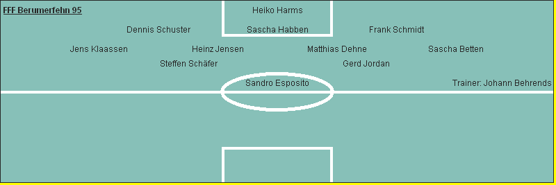 FFF Berumerfehn 95: Heiko Harms - Dennis Schuster, Sascha Habben, Frank Schmidt - Jens Klaassen, Heinz Jensen, Matthias Dehne, Sascha Betten - Steffen Schäfer, Gerd Jordan - Sandro Esposito; Trainer: Johann Behrends Eingewechselt: Marco Klaassen, Holger Lamberti, Kai Wilts Tore: 1:0 Steffen Schäfer (Freistehend aus kurzer Distanz eingeschoben, 26. / Sandro Esposito); 2:0 Sandro Esposito (Kopfball nach Freistoß, 33. / Heinz Jensen); 3:0 Heinz Jensen (Freistoß, 36. / Steffen Schäfer); 4:0 Gerd Jordan (Aus kurzer Entfernung, 68. / Sandro Esposito); 4:1 Keno Boomgaarden (Schuss aus 11 m, 78.); 5:1 Steffen Schäfer (Freistehend aus kurzer Distanz eingeschoben, 81. / Sandro Esposito); 6:1 Sascha Habben (Foulelfmeter, 87. / Kai Wilts) Gelbe Karte: Sascha Betten (2.) (53.), Kai Wilts (88.) / - Mit einem nie für möglich gehaltenen 6-1 über Conc. Suurhusen II feierten die Fehntjer-Fußball-Freunde in ihrem zweiten Heimspiel den ersten dreifachen Punktgewinn. Das Spiel, das kurzfristig von Suurhusen nach Westermoordorf verlegt wurde, stand trotz der sieben Tore im Zeichen von vergebenen Torgelegenheiten und hätte bei konsequenter Chancenverwertung beider Seiten auch 10-5 enden können. Bereits in den ersten acht Minuten hatten die gastgebenden FFF zwei glasklare Möglichkeiten durch Sandro Esposito und Heinz Jensen. Esposito schoss aus 11 m nach Rechtsflanke von Jens Klaassen über das Tor; Heinz Jensen scheiterte mit seinem Schuss aus 16 m am gut reagierenden Schlussmann Mario Ulferts aus Suurhusen. Die überfällige Führung für die FFF erzielte dann in der 26. Min. Steffen Schäfer, der nach schöner Vorarbeit von Sandro Esposito freistehend aus 5 m flach einschieben konnte. Nach der Führung verpasste es Jens Klaassen zweimal, die Führung auszubauen. Beide Male hielt TW Mario Ulferts die Flachschüsse von Klaassen. Besser machte es Sandro Esposito in der 33. Min. Einen langgezogenen Freistoß von Heinz Jensen köpfte er zum 2-0 ein. Nur drei Minuten später war es Heinz Jensen, der einen Freistoß aus 20 m direkt zum Halbzeitstand von 3-0 verwandelte. In den ersten fünf Minuten nach der Pause waren es Sascha Betten, Steffen Schäfer und der sehr agile Sandro Esposito, die beste Gelegenheiten für die FFF verpassten. Im Anschluss daran hatten die Fehntjer ihrerseits Glück, dass TW Heiko Harms bei zwei guten Torgelegenheiten der Suurhusener, die beide Male frei vor ihm auftauchten, hervorragend reagierte und den Anschlusstreffer für Suurhusen verhinderte. Mit dem 4-0 durch Gerd Jordan in der 68. Min. war die Partie dann entschieden. Jordan verwertete einen Querpass von Sandro Esposito. Am Sieg der Fehntjer änderte auch der Anschlusstreffer für Suurhusen durch Boomgaarden in der 78. Min. nichts mehr. Steffen Schäfer mit seinem zweiten Treffer in der 81. Min. und Sascha Habben in der 87. Min., der nach einem Foul an Kai Wilts den fälligen Strafstoß sicher verwandelte, sorgten für den 6:1-Endstand. |