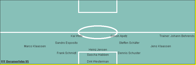 FFF Berumerfehn 95: Dirk Westerman - Dennis Schuster, Sascha Habben, Frank Schmidt - Heinz Jensen - Jens Klaassen, Marco Klaassen - Steffen Schäfer, Sandro Esposito - Simon Apetz, Kai Wilts; Trainer: Johann Behrends Eingewechselt: Sascha Betten, Gerd Jordan Tore: 0:1 Steffen Schäfer (Heber über den Torwart, 14. / Simon Apetz); 0:2 Kai Wilts (Aus kurzer Entfernung, 53. / Steffen Schäfer); 0:3 Heinz Jensen (Schlenzer ins lange Eck, 71. / Sascha Betten); 1:3 Sven Schmit (Abstauber, 74.) Gelbe Karte: - / Frank Schmidt (5.) (32.), Heinz Jensen (3.) (50.) Vergebener Elfmeter: - / Steffen Schäfer (Foulelfmeter, 25., gehalten von Mario Ulferts) Hochverdient mit 3-1 gewannen die Fehntjer-Fußball-Freunde auch das zweite Auswärtsspiel in Folge bei der Reserve von Concordia Suurhusen. Nachdem Kai Wilts in der 10. Min. bereits die erste große Torgelegenheit vergab, als er nach einem Querpass von Steffen Schäfer den Ball aus 11 m über das Tor schoss, machte es Steffen Schäfer in der 14. Min. besser. Einen schönen Pass in den freien Raum von Simon Apetz lupfte er über den gegnerischen Torhüter zur 1:0-Führung der Fehntjer ins Netz. Derselbe Spieler vergab in der 25. Min. die Riesengelegenheit zum 2-0. Nach einem Foul an ihm selbst schoss er den anschließenden Foulelfmeter dermaßen unplaciert, dass Schlussmann Mario Ulferts den Ball halten konnte. Schäfer beachtete dabei nicht die alte Fußballerregel, dass der gefoulte Spieler niemals den nachfolgenden Strafstoß ausführen soll. Zwei Minuten nach dem vergebenen Elfmeter hämmerte Dennis Schuster einen direkten Freistoß an die Latte des Suurhusener Gehäuses, und in der 40. Min. vergibt Simon Apetz, als er vollkommen freistehend vor dem Tor noch einmal querspielt auf Kai Wilts, dessen zu lascher Schuss dann von einem gegnerischen Verteidiger zur Ecke geschlagen wird. Kurz zuvor war den Fehntjern nach einem Foul an Sandro Esposito ein weiterer klarer Foulelfmeter vom insgesamt stark leitenden Schiedsrichter Joachim Frerichs vom VfB Münkeboe verweigert worden. Die Gastgeber hätten sich nicht beklagen können, wenn sie zur Pause deutlicher zurückgelegen hätten. Nach Wiederanpfiff beherrschten die Gäste aus Berumerfehn weiterhin das Spielgeschehen. Einen schönen Pass von Steffen Schäfer vollendete Kai Wilts in der 53. Min. zur beruhigenden 2:0-Führung der Gäste. Mit der Pike schoss er aus kurzer Distanz ins kurze Eck ein. Die endgültige Entscheidung besorgte Heinz Jensen in der 71. Min. Nach Vorarbeit von Sascha Betten schlenzte er aus halblinker Position den Ball mit dem rechten Aussenrist unhaltbar für Keeper Mario Ulferts ins lange Eck. Eine Unachtsamkeit in der Fehntjer Hintermannschaft nutzte Sven Schmidt in der 74. Min. zum Ehrentreffer für Suurhusen. Obwohl die Gastgeber in den Schlussminuten alles versuchten, dem Spiel noch einmal eine Wende zu geben, kamen sie nur noch zu einer guten Gelegenheit, die Schlussmann Dirk Westerman, der den etatmäßigen Torwart Heiko Harms glänzend vertrat, mit einer tollen Parade zunichte machte. |