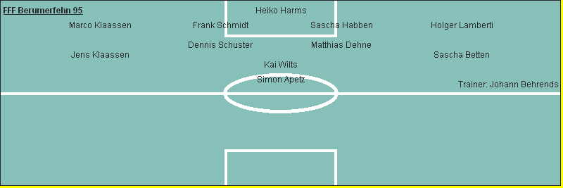 FFF Berumerfehn 95: Heiko Harms - Marco Klaassen, Frank Schmidt, Sascha Habben, Holger Lamberti - Dennis Schuster, Matthias Dehne - Jens Klaassen, Sascha Betten - Kai Wilts - Simon Apetz; Trainer: Johann Behrends Eingewechselt: Jochen Neiße, Heinz Jensen, Gerd Jordan Tore: 0:1 Matthias Erdmann (Direktschuss, 8.); 1:1 Kai Wilts (Aus kurzer Entfernung, 36. / Sascha Betten); 1:2 Wilko Gerdes (Einzelleistung, 57.); 1:3 Wilko Gerdes (Freistehend nach langem Ball in die Spitze, 73.); 1:4 Gero Kleen (Foulelfmeter, 81.); 1:5 Gedo Ihben (Nach Torwartfehler, 90.) Gelbe Karte: Kai Wilts (4.) (19.), Matthias Dehne (3.) (29.), Holger Lamberti (80.) / - Das kurzfristig nach Westermoordorf verlegte Ortsderby sah im SV Arle einen verdienten Sieger. Der 5:1-Erfolg fiel aber insgesamt betrachtet um mndestens zwei Tore zu hoch aus. Von Beginn an zeigte der Tabellenführer, dass er dieses Spiel unbedingt gewinnen wollte. Die ersten fünfzehn Minuten gehörten eindeutig den Gästen, die durch einen schönen Direktschuss von Matthias Erdmann frühzeitig in der 8. Min. in Führung gingen. Vorausgegangen war ein unnötiger Ballverlust von Sascha Betten auf der linken Abwehrseite. Vom Schock des frühen Rückstandes erholten sich die Fehntjer erst nach knapp einer halben Stunde, und jetzt erspielten sich auch die Gastgeber die ersten Torchancen. Eine nutzte Kai Wilts in der 36. Min. zum Ausgleich, als er eine flache Hereingabe von links durch Sascha Betten aus kürzester Distanz einschieben konnte. Mit viel Elan kamen die Gäste vom SV Arle zur zweiten Halbzeit aus der Kabine. Innerhalb von fünf Minuten erspielten sie sich drei riesige Torgelegenheiten, die jedoch allesamt vergeben bzw. vom gut aufgelegten Schlussmann Heiko Harms zunichte gemacht wurden. Als der große Druck scheinbar etwas nachließ, war es eine tolle Einzelleistung von Wilko Gerdes, die das Spiel zugunsten des SV Arle vorentschied. Gerdes setzte sich am linken Flügel gegen vier Fehntjer Abwehrspieler im Alleingang durch, und gegen seinen Schuss aus 11 m hatte TW Heiko Harms keine Abwehrchance (57. Min.). Danach taten die Gäste nur noch das Allernötigste, und den gastgebenden Fehntjer-Fußball-Freunden fiel gegen die gut gestaffelte Arler Abwehr auch nur wenig ein. Einen Abspielfehler der Fehntjer im Mittelfeld nutzten die Gäste dann zu einem schnellen Pass in die Spitze auf Wilko Gerdes, der keine Mühe hatte, in der 73. Min. für die Entscheidung zu sorgen. Einen Strafstoß, verursacht durch Holger Lamberti, verwandelte der starke Gero Kleen in der 81. Min. zum 1-4, und in der Schlussminute nutzte Gedo Ihben nach einem Eckball einen Torwartfehler zum Endstand von 1-5. |