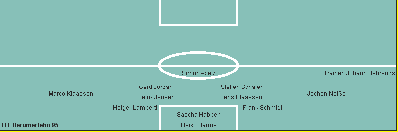 FFF Berumerfehn 95: Heiko Harms - Frank Schmidt, Sascha Habben, Holger Lamberti - Jens Klaassen, Heinz Jensen - Jochen Neiße, Marco Klaassen - Steffen Schäfer, Gerd Jordan - Simon Apetz; Trainer: Johann Behrends Eingewechselt: Sascha Betten, Sandro Esposito Tore: 1:0 Frank Wilts (Flachschuss, 64.); 2:0 Wilko Gerdes (Abstauber, 82.) Gelbe Karte: - / Heinz Jensen (6.) (32.), Marco Klaassen (4.) (42.), Frank Schmidt (9.) (43.) Der zukünftige Kreisligist SV Arle gewann verdient mit 2-0 gegen eine starke FFF-Mannschaft, die sich bis zur 64. Min. mehr als achtbar aus der Affäre zog. Hochkonzentriert und taktisch sehr diszipliniert ließen die Gäste aus Berumerfehn den Gastgebern wenig Platz und Zeit für ihr Kombinatonsspiel. So waren Torgelegenheiten für den SV Arle Mangelware, aber auch den sehr defensiv eingestellten Fehntjer-Fußball-Freunden boten sich bei den wenigen Kontern kaum Torchancen. Ein Abwehrfehler der Fehntjer führte dann in der 64. Min. zum 1-0 für den SV Arle. Nachdem sich Wilko Gerdes auf der rechten Seite durchsetzen konnte, war in der Mitte Frank Wilts eher am Ball als zwei Abwehrspieler und schoss aus etwa 11 m unhaltbar zur Führung für Arle ein. Ein weiterer Abwehrfehler bescherte den Arlern in der 82. Min. auch das 2-0. Simon Apetz versprang im Fünfmeterraum ein Ball, und Wilko Gerdes hatte keine Mühe, aus kurzer Distanz zur Entscheidung abzustauben. Der Sieg für den SV Arle geht in Ordnung. Hätten die Gäste in vielen anderen verloren gegangenen Spielen ähnlich diszipliniert aufgetrumpft, stünden sicherlich mehr Punkte auf der Habenseite der FFF. |